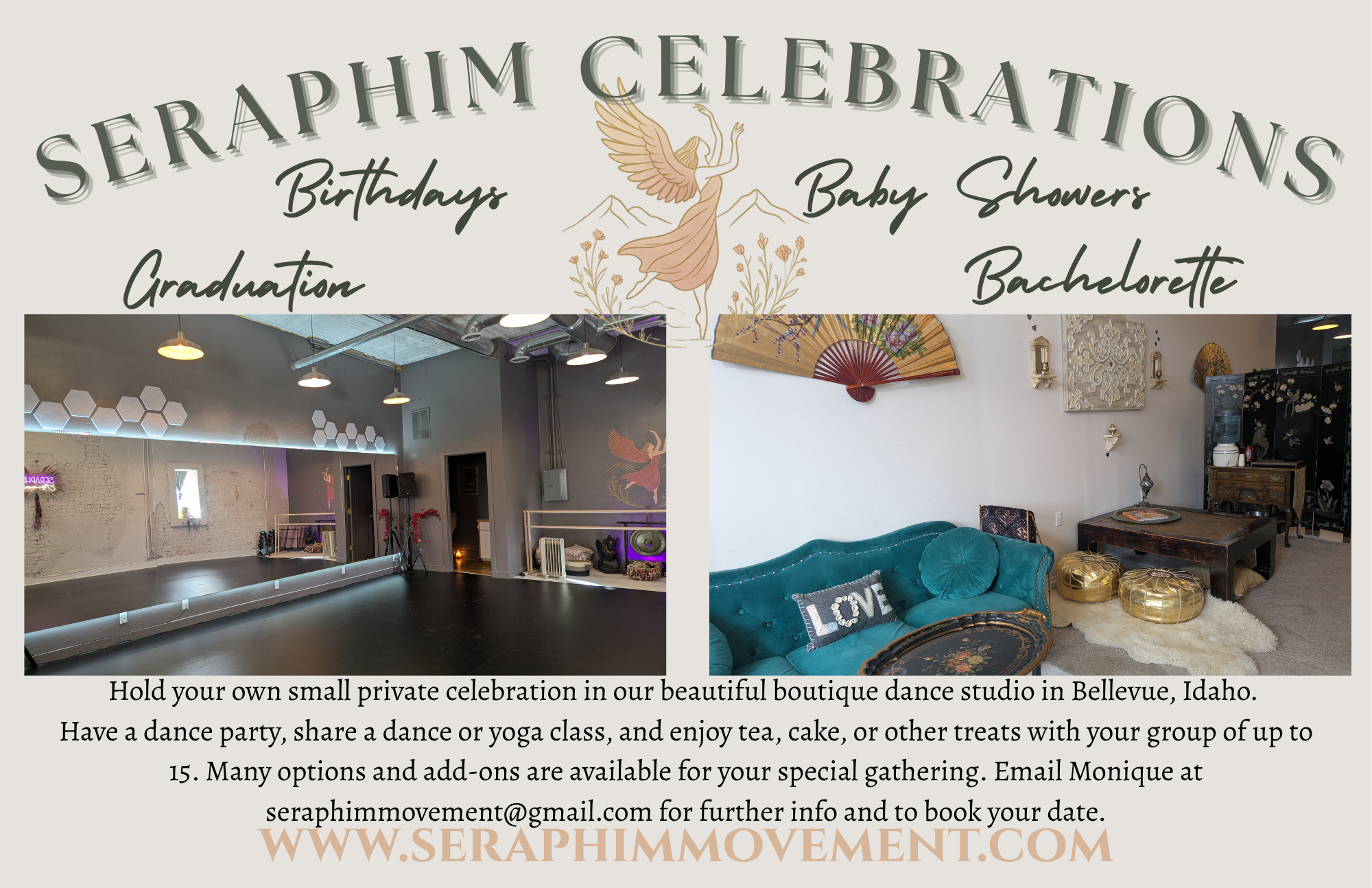 Now offering Seraphim Celebrations private parties in our beautiful studio! Visit the “About” page for more info, or email seraphimmovement@gmail.com for more information and a pricelist of options and add-on services.
